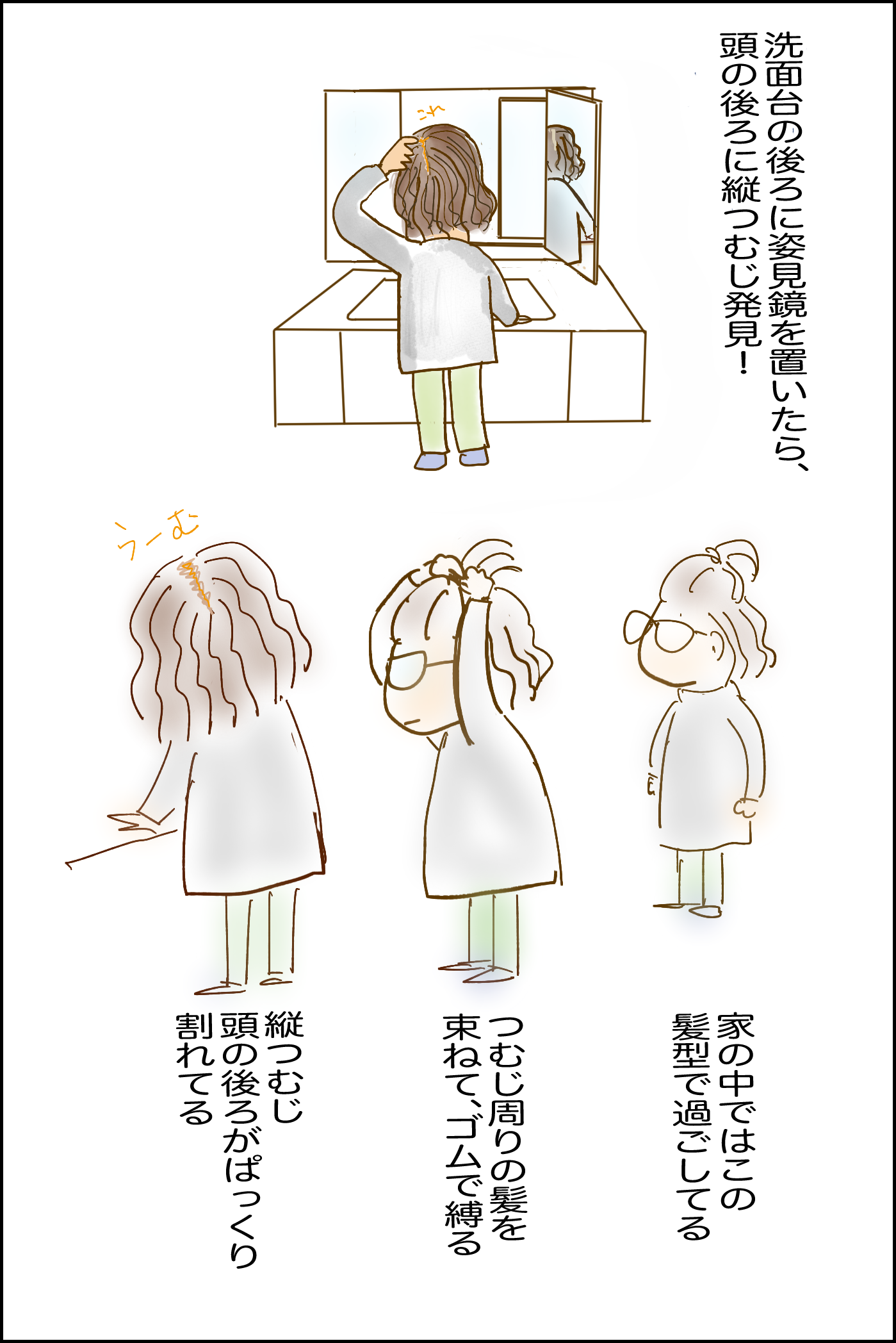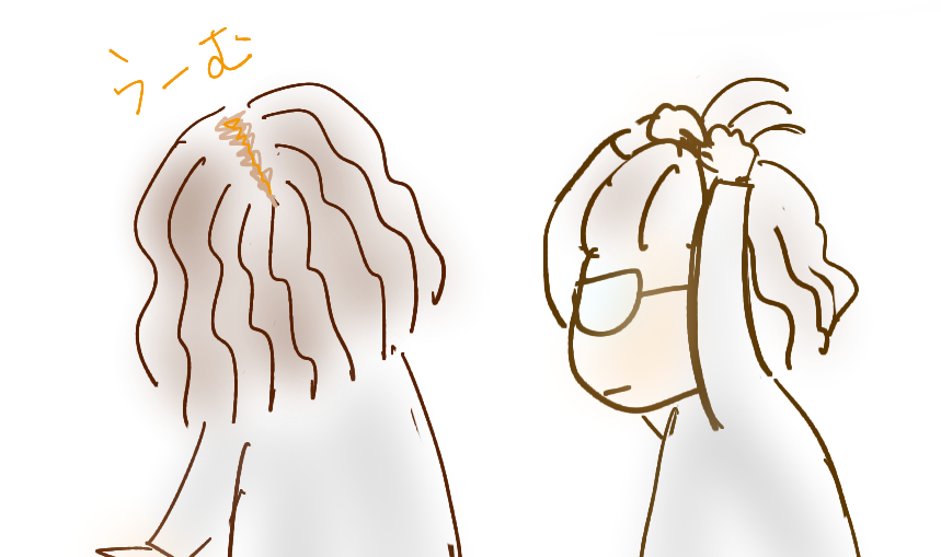 2026.1.6_縦つむじ 絵日記 X Facebook はてブ LINE Pinterest コピー 2026.01.06 絵日記2026.1.6 つむじが縦に割れがちな頭。 ドライヤーで乾かす時に割れないよう、割れないよう気をつけてる。 でも割れてる。 結果、トップの髪の毛を束にしてゴムで縛って、家にいる時はこの髪型ですごしてる。
